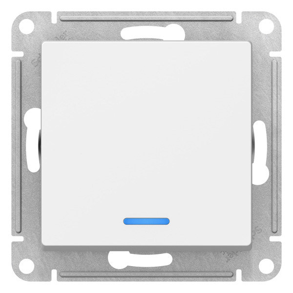 Механизм выключателя 1-клавишного с подсветкой коллекции AtlasDesign в исполнении белый Применим для подключения к сетям 250 В с номинальным током 10 А.. - Пластик с ионами серебра в белом исполнении обеспечивает антибактериальный эффект. - Благодаря светодиодной подсветке синего цвета изделие легко найти в темноте. - Лицевые панели из качественного ABS-пластика, устойчивого к царапинам и УФ-излучению. - Усиленные прямые монтажные лапки для лучшей фиксации механизма в монтажной коробке.