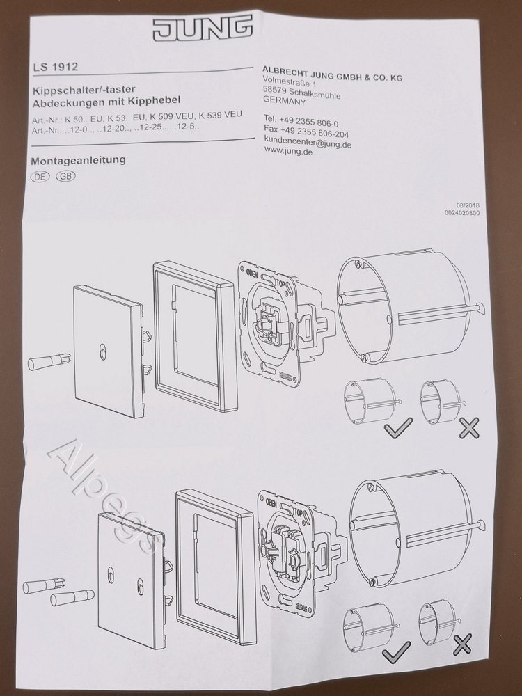 K501EU Jung Механизм серии LS1912 одноклавишный, крепление винтами, без монтажных лапок