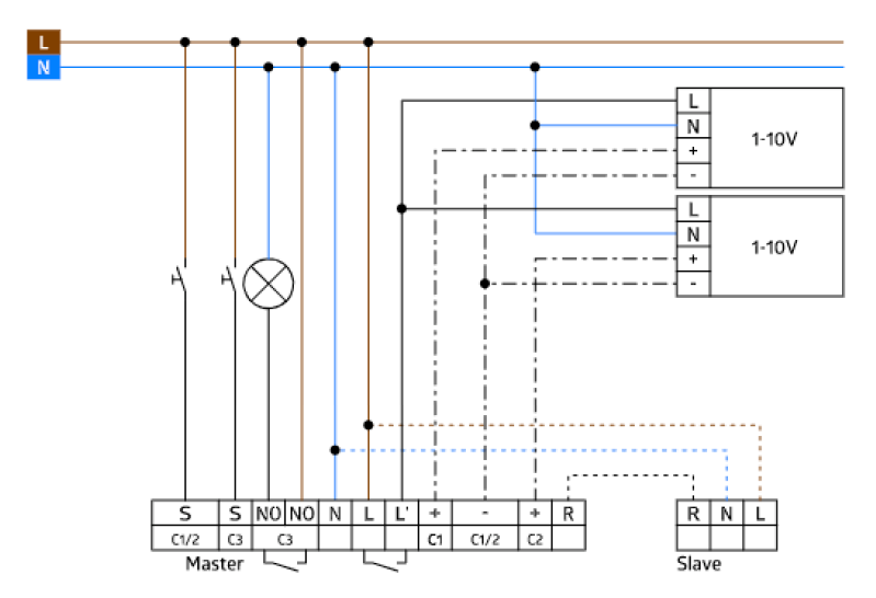 - Кнопка 1: входящий контакт 230 В для кнопки включения/выключения и диммирования света