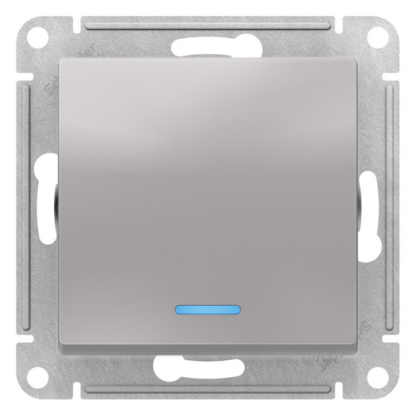 Механизм переключателя 1-клавишного с подсветкой коллекции AtlasDesign в исполнении алюминий Применим для подключения к сетям 250 В с номинальным током 10 А.. - Благодаря светодиодной подсветке синего цвета изделие легко найти в темноте. - Переключатель позволяют управлять одним источником света с двух точек. - Лицевые панели из качественного ABS-пластика, устойчивого к царапинам и УФ-излучению.