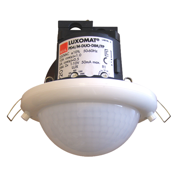 - Дистанционно управляемый потолочный датчик присутствия PD4-M-DUO-DIM в исполнении для диммирования света для открытого, потолочного или скрытого монтажа, для двух отдельных групп освещения, с круговым диапазоном обнаружения и дальностью действия около 24 м