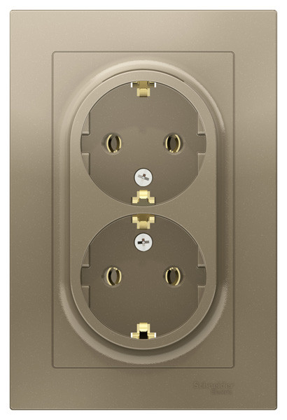 Розетка двойная коллекции AtlasDesign (в сборе, цвет шампань) с заземлением, без шторок Подходит для использования в сетях напряжением 250 В с током до 16 А. - Заземляющий контакт обеспечивает дополнительную защиту от удара электрическим током. - Лицевые панели из качественного ABS-пластика, устойчивого к царапинам и УФ-излучению. - Двойная розетка позволяет подключить два устройства в одном месте. - Изделие поставляется в комплекте с рамкой того же цвета.