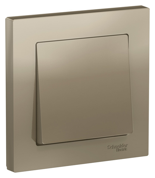 Выключатель 1-клавишный в сборе коллекции AtlasDesign в исполнении шампань Применим для подключения к сетям 250 В с номинальным током 10 А.. - Лицевые панели из качественного ABS-пластика, устойчивого к царапинам и УФ-излучению. - Изделие поставляется в комплекте с рамкой того же цвета. - Усиленные прямые монтажные лапки для лучшей фиксации механизма в монтажной коробке.