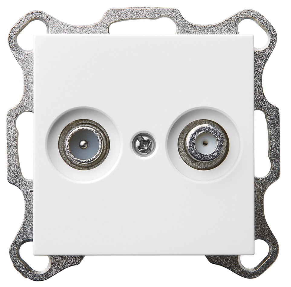 Розетка TV+FM Ф9.5mm проходная с накладкой, цвет белый глянцевый, G6205W, JASMART