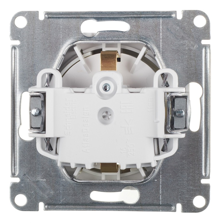 Механизм коллекции AtlasDesign в исполнении белый розетки одинарной с заземлением, шторками с выталкивателем Подходит для использования в сетях напряжением 250 В с током до 16 А. - Пластик с ионами серебра в белом исполнении обеспечивает антибактериальный эффект. - Заземляющий контакт обеспечивает дополнительную защиту от удара электрическим током. - Оснащена специальным механизмом: рычаг при повороте выталкивает вилку из розетки, что особенно удобно при частом подключении к розетке массивных вилок от бытовых приборов.