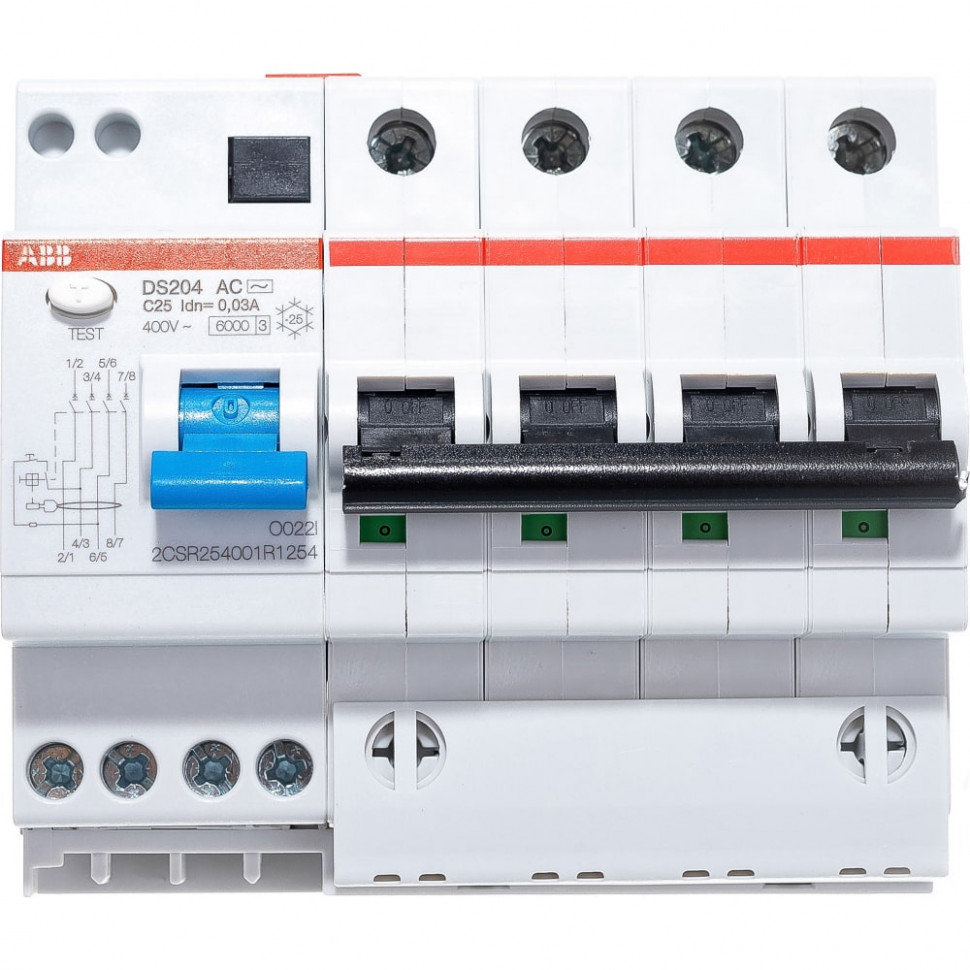 ABB DS204 C25 Диффавтомат 4P 25А 30mA 6kA (C) тип AC выполняет следующие функции: защита от перегрузки и токов короткого замыкания; защита от воздействия синусоидальных переменных токов замыкания на землю; защита от непрямых контактов и дополнительная защита от прямых контактов.