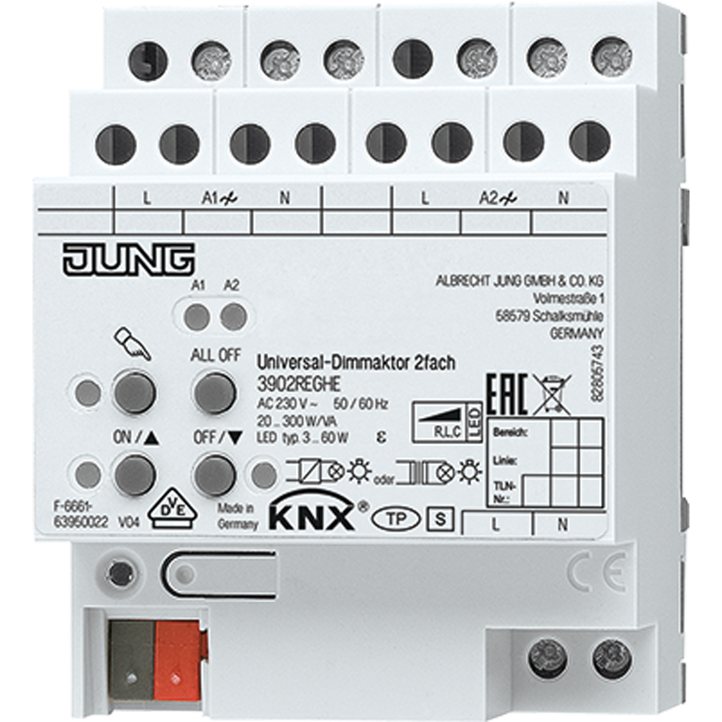 3902REGHE KNX универсальный диммер, 2 канала 20-300 W/VA
