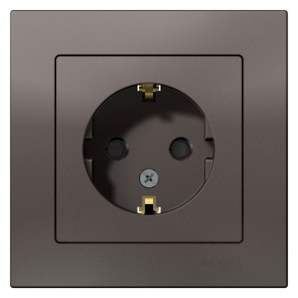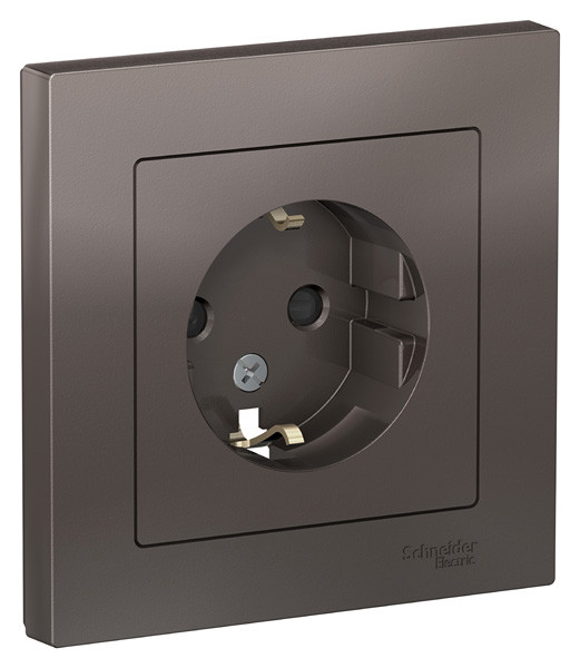 Розетка коллекции AtlasDesign (в сборе, цвет мокко) 1-ая с заземлением и без шторок Подходит для использования в сетях напряжением 250 В с током до 16 А. - Заземляющий контакт обеспечивает дополнительную защиту от удара электрическим током. При наличии заземления электрический потенциал уходит в землю, защищая человека. - Лицевые панели из качественного ABS-пластика, устойчивого к царапинам и УФ-излучению. - Изделие поставляется в комплекте с рамкой того же цвета.