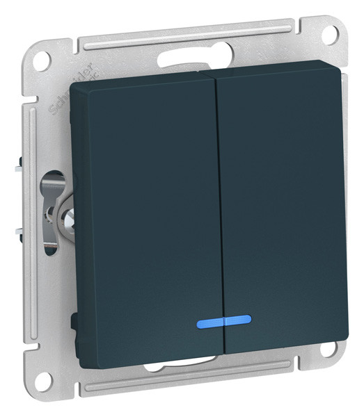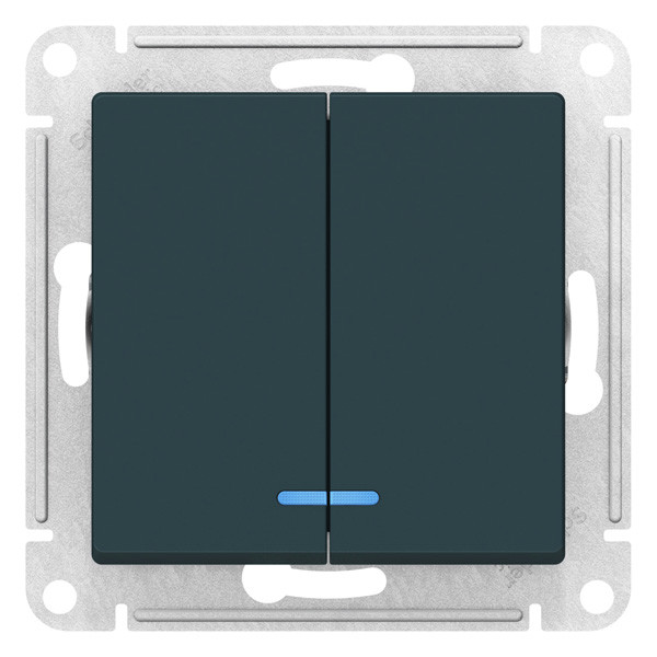 Механизм коллекции AtlasDesign в исполнении изумруд выключателя 2-клавишного c подсветкой Применим для подключения к сетям 250 В с номинальным током 10 А.. - Благодаря светодиодной подсветке синего цвета изделие легко найти в темноте. - Двухклавишный выключатель позволяет управлять двумя источниками света с одной точки. - Лицевые панели из качественного ABS-пластика, устойчивого к царапинам и УФ-излучению.