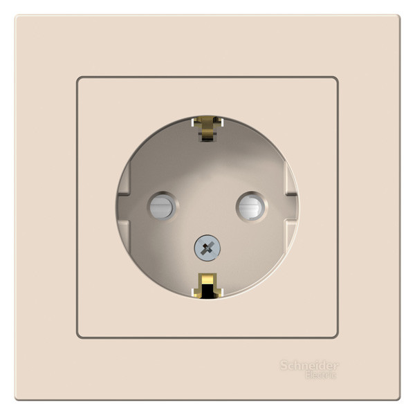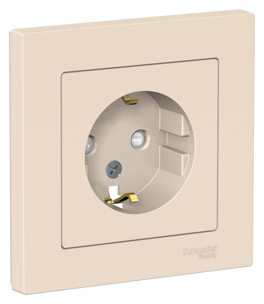 Розетка коллекции AtlasDesign (в сборе, цвет бежевый) 1-ая с заземлением и без шторок Подходит для использования в сетях напряжением 250 В с током до 16 А. - Заземляющий контакт обеспечивает дополнительную защиту от удара электрическим током. При наличии заземления электрический потенциал уходит в землю, защищая человека. - Лицевые панели из качественного ABS-пластика, устойчивого к царапинам и УФ-излучению. - Изделие поставляется в комплекте с рамкой того же цвета.