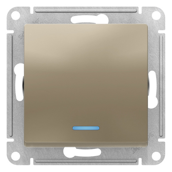 Механизм переключателя 1-клавишного с подсветкой коллекции AtlasDesign в исполнении шампань Применим для подключения к сетям 250 В с номинальным током 10 А.. - Благодаря светодиодной подсветке синего цвета изделие легко найти в темноте. - Переключатель позволяют управлять одним источником света с двух точек. - Лицевые панели из качественного ABS-пластика, устойчивого к царапинам и УФ-излучению. - Усиленные прямые монтажные лапки для лучшей фиксации механизма в монтажной коробке.