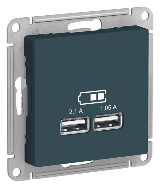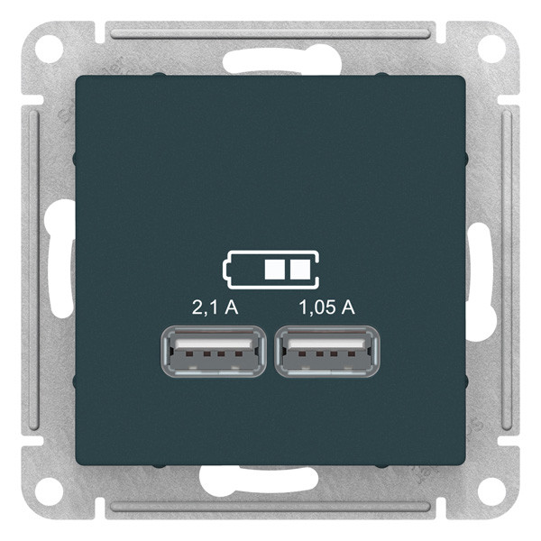 Механизм коллекции AtlasDesign в исполнении изумруд розетки для зарядки с двумя разъёмами USB с выходными напряжением 5 В постоянного тока и выходами с номинальным током по 2,1 А. - USB розетка позволяет напрямую заряжать одно или два мобильных устройства. - Лицевые панели из качественного ABS-пластика, устойчивого к царапинам и УФ-излучению. - Усиленные прямые монтажные лапки для лучшей фиксации механизма в монтажной коробке.