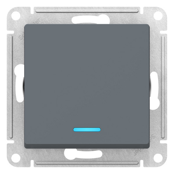Механизм переключателя 1-клавишного с подсветкой коллекции AtlasDesign в исполнении грифель Применим для подключения к сетям 250 В с номинальным током 10 А.. - Благодаря светодиодной подсветке синего цвета изделие легко найти в темноте. - Переключатель позволяют управлять одним источником света с двух точек. - Лицевые панели из качественного ABS-пластика, устойчивого к царапинам и УФ-излучению. - Усиленные прямые монтажные лапки для лучшей фиксации механизма в монтажной коробке.