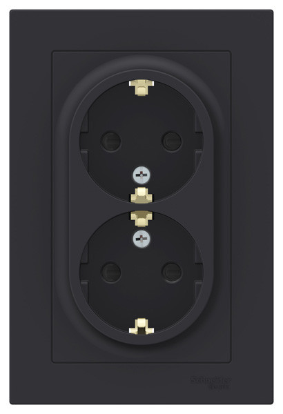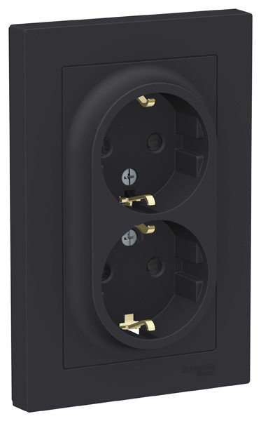 Розетка двойная коллекции AtlasDesign (в сборе, цвет карбон) с заземлением и шторками Подходит для использования в сетях напряжением 250 В с током до 16 А. - Заземляющий контакт обеспечивает дополнительную защиту от удара электрическим током. - Двойная розетка позволяет подключить два устройства в одном месте. - Изделие поставляется в комплекте с рамкой того же цвета. - Благодаря покрытию «soft touch» к изделию приятно прикасаться.