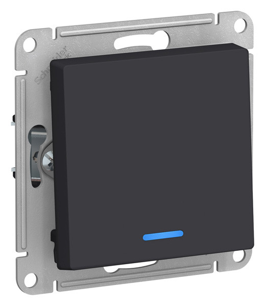 Механизм выключателя 1-клавишного с подсветкой коллекции AtlasDesign в исполнении карбон Применим для подключения к сетям 250 В с номинальным током 10 А.. - Благодаря светодиодной подсветке синего цвета изделие легко найти в темноте. - Лицевые панели из качественного ABS-пластика, устойчивого к царапинам и УФ-излучению. - Благодаря покрытию «soft touch» к изделию приятно прикасаться.