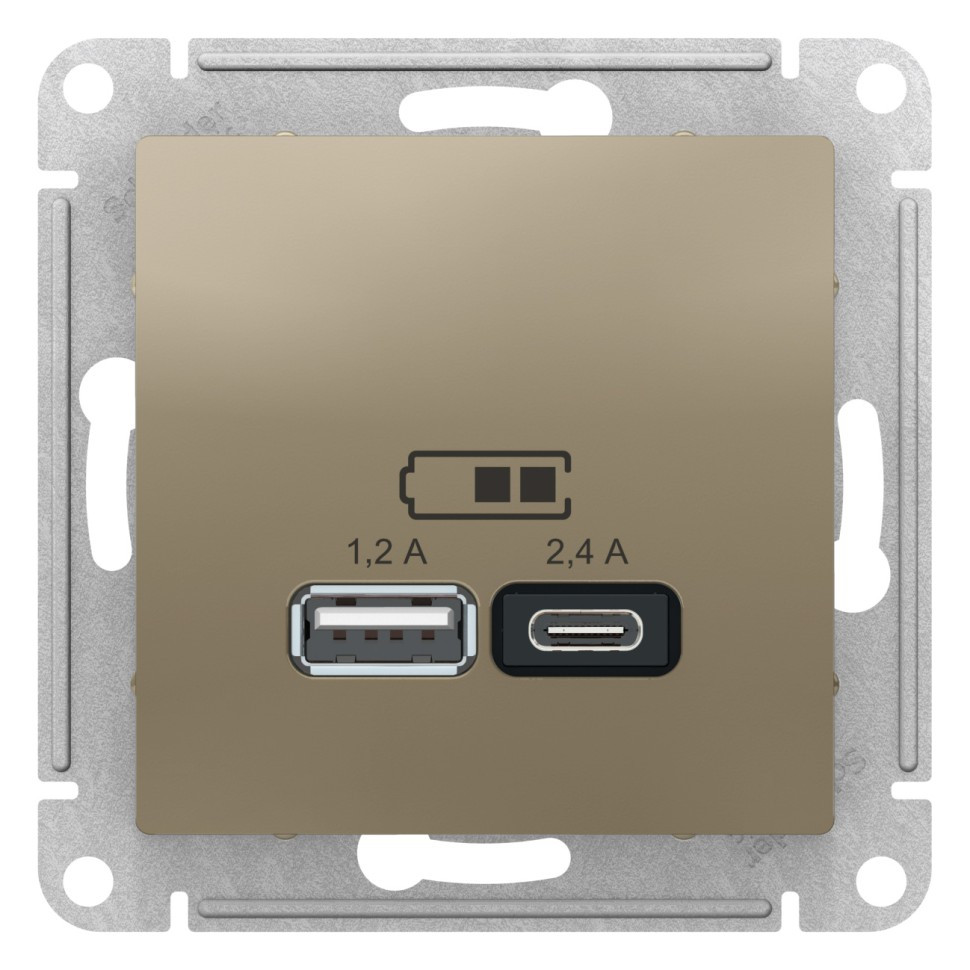 Розетка коллекции AtlasDesign в исполнении шампань двойная USB с разъемами типа A+C - Лицевые панели из качественного ABS-пластика, устойчивого к царапинам и УФ-излучению. - Самая современная USB-зарядка с двумя разъемами позволяет заряжать как стандартные мобильные устройства через разъем типа А, так и новейшие устройства, в том числе ноутбуки, с разъемом типа С.