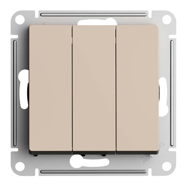 Механизм коллекции AtlasDesign в исполнении ПЕСОЧНЫЙ выключателя 3-клавишного Применим для подключения к сетям 250 В с номинальным током 10 А.. - Трёхклавишный выключатель позволяет управлять тремя источниками света из одной точки. - Лицевые панели из качественного ABS-пластика, устойчивого к царапинам и УФ-излучению. - Усиленные прямые монтажные лапки для лучшей фиксации механизма в монтажной коробке.