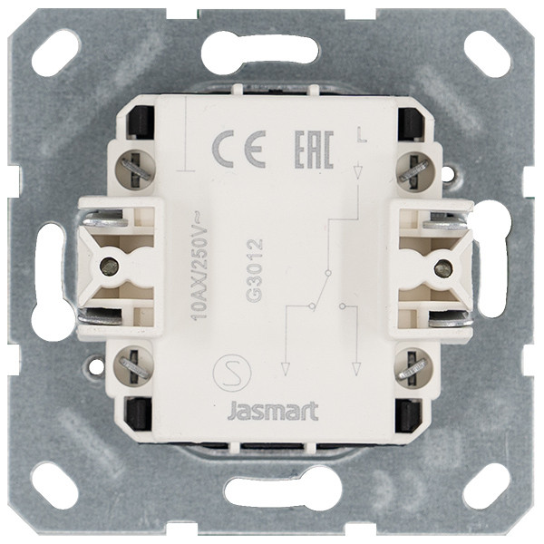 Выключатель одноклавишный проходной 10A 250V~ с накладкой, цвет белый глянцевый, G3012W, JASMART