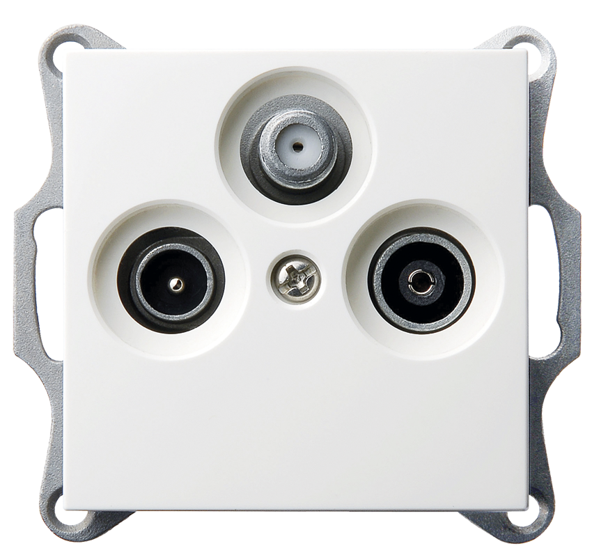 Розетка TV+FM+SAT Ф9.5mm проходная с накладкой, цвет белый глянцевый, G6207W, JASMART