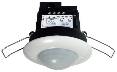 Датчик присутствия потолочный 360° , двухканальный, скрытый монтаж в подвесной потолок, диапазон обнаружения: перпендикулярно - Ø 10 м, фронтально - Ø 6 м, зона присутствия - Ø 4 м; высота монтажа: мин. 2 м / макс. 5 м / рекомендуемая 2,5 м; канал 1 (управление освещением, беспотенциальный (сухой) NO-контакт): 3 A; cos φ = 1, канал 2 (HVAC, беспотенциальный (сухой) NO-контакт): 3 A; cos φ = 1; сетевое напряжение 12 – 48 V AC / DC; размеры Ø 80 x 85 мм, IP20, белый.Характеристики: