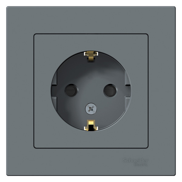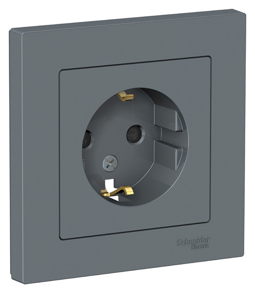 Розетка коллекции AtlasDesign (в сборе, цвет грифель) 1-ая с заземлением и без шторок Подходит для использования в сетях напряжением 250 В с током до 16 А. - Заземляющий контакт обеспечивает дополнительную защиту от удара электрическим током. При наличии заземления электрический потенциал уходит в землю, защищая человека. - Лицевые панели из качественного ABS-пластика, устойчивого к царапинам и УФ-излучению. - Изделие поставляется в комплекте с рамкой того же цвета.