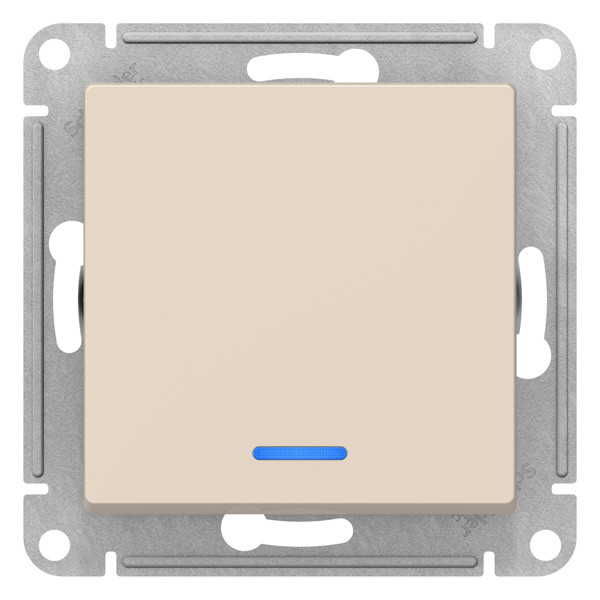 Механизм выключателя 1-клавишного с подсветкой коллекции AtlasDesign в бежевом исполнении Применим для подключения к сетям 250 В с номинальным током 10 А.. - Пластик с ионами серебра в белом исполнении обеспечивает антибактериальный эффект. - Благодаря светодиодной подсветке синего цвета изделие легко найти в темноте. - Лицевые панели из качественного ABS-пластика, устойчивого к царапинам и УФ-излучению. - Усиленные прямые монтажные лапки для лучшей фиксации механизма в монтажной коробке.