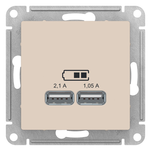 Механизм коллекции AtlasDesign в исполнении бежевый розетки для зарядки с двумя разъёмами USB с выходными напряжением 5 В постоянного тока и выходами с номинальным током по 2,1 А. - USB розетка позволяет напрямую заряжать одно или два мобильных устройства. - Лицевые панели из качественного ABS-пластика, устойчивого к царапинам и УФ-излучению. - Усиленные прямые монтажные лапки для лучшей фиксации механизма в монтажной коробке.
