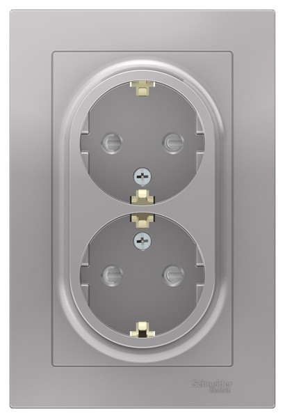 Розетка двойная коллекции AtlasDesign (в сборе, цвет алюминий) с заземлением и шторками Подходит для использования в сетях напряжением 250 В с током до 16 А. - Заземляющий контакт обеспечивает дополнительную защиту от удара электрическим током. - Лицевые панели из качественного ABS-пластика, устойчивого к царапинам и УФ-излучению. - Двойная розетка позволяет подключить два устройства в одном месте. - Изделие поставляется в комплекте с рамкой того же цвета.