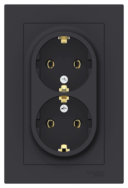 Розетка двойная коллекции AtlasDesign (в сборе, цвет карбон) с заземлением, без шторок Подходит для использования в сетях напряжением 250 В с током до 16 А. - Заземляющий контакт обеспечивает дополнительную защиту от удара электрическим током. - Двойная розетка позволяет подключить два устройства в одном месте. - Изделие поставляется в комплекте с рамкой того же цвета. - Благодаря покрытию «soft touch» к изделию приятно прикасаться.