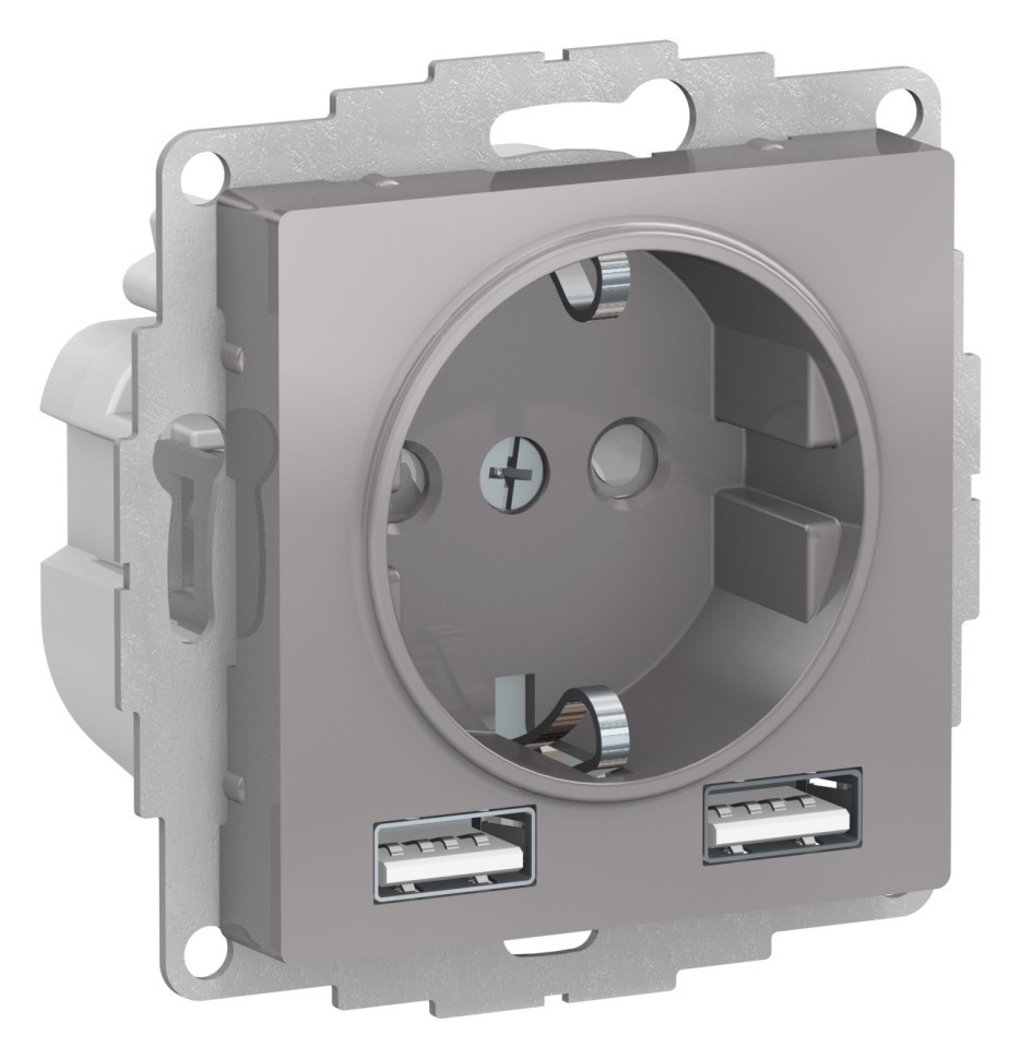 Розетка силовая коллекции AtlasDesign 16А (цвет алюминий) с заземлением и шторками с розеткой USB, с друмя разъемами типа А - Лицевые панели из качественного ABS-пластика, устойчивого к царапинам и УФ-излучению. - Заземляющий контакт обеспечивает дополнительную защиту от удара электрическим током. - Шторки обеспечивают дополнительную безопасность в доме, где находятся дети. - Один механизм позволяет как подключить бытовые приборы, так и зарядить мобильные устройства.