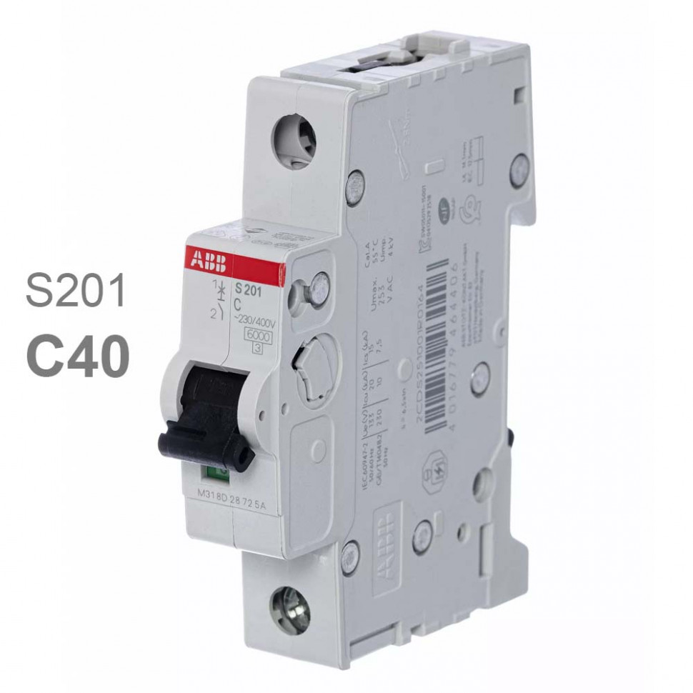 Выключатель однополюсный S201-C40 40A имеет следующие параметры: номинальный ток 40А, характеристику С, ток короткого замыкания 6 кА. Область применения: жилые, коммерческие и промышленные помещения.