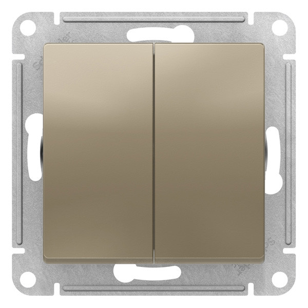 Механизм выключателя 2-клавишного коллекции AtlasDesign в исполнении шампань Применим для подключения к сетям 250 В с номинальным током 10 А.. - Двухклавишный выключатель позволяет управлять двумя источниками света с одной точки. - Лицевые панели из качественного ABS-пластика, устойчивого к царапинам и УФ-излучению. - Усиленные прямые монтажные лапки для лучшей фиксации механизма в монтажной коробке.