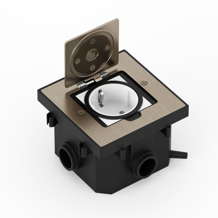 -, так и в индивидуальных помещениях и комнатах переговоров, предназначены для монтажа модульных электроустановочных изделий 45х45 в плиты фальш-пола или в бетонный пол.- Степень защиты от влаги и пыли IP44- Степень защиты от ударов IK09- Установка заподлицо с напольным покрытием (при установке в стяжку)- Возможность установки составного блока из нескольких лючков- В комплект поставки входят установочная коробка для фальш-пола и коробка для стяжкиВНИМАНИЕ! Степень защиты IP44 возможна только при полностью закрытой крышке лючка, при этом не допускается ни каких внешнихподключений к электроустановочным модулям, установленным в лючке. Внимание! Электроустановочные изделия, информационные и мультимедийные розетки в комплект поставки не входят