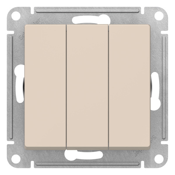 Механизм коллекции AtlasDesign в бежевом исполнении выключателя 3-клавишного Применим для подключения к сетям 250 В с номинальным током 10 А.. - Трёхклавишный выключатель позволяет управлять тремя источниками света из одной точки. - Лицевые панели из качественного ABS-пластика, устойчивого к царапинам и УФ-излучению. - Усиленные прямые монтажные лапки для лучшей фиксации механизма в монтажной коробке.