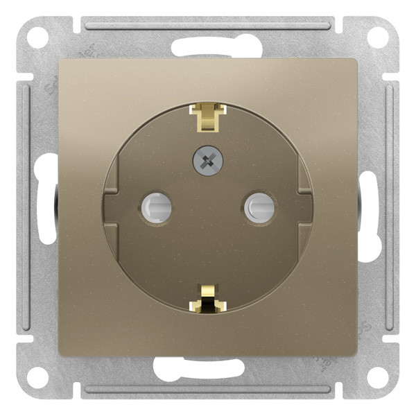 Механизм коллекции AtlasDesign в исполнении шампань розетки одинарной с заземлением и шторками Подходит для использования в сетях напряжением 250 В с током до 16 А. - Заземляющий контакт обеспечивает дополнительную защиту от удара электрическим током. При наличии заземления электрический потенциал уходит в землю, защищая человека. - Лицевые панели из качественного ABS-пластика, устойчивого к царапинам и УФ-излучению. - Усиленные прямые монтажные лапки для лучшей фиксации механизма в монтажной коробке.