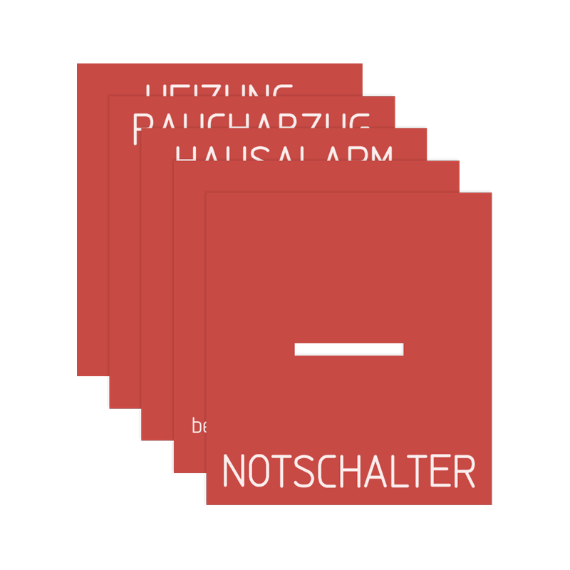 with inscription "Rauchabzug ffnen, Hausalarm, Heizung Notschalter, Notschalter, Bei Feuer Scheibe einschlagen – Taste drcken".