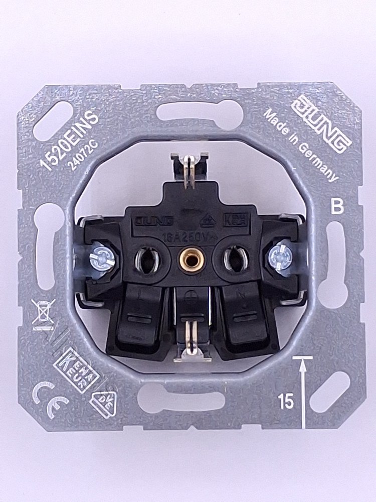 с пружинными зажимами для проводов до 2,5 мм2 соединительные клеммы согласно DIN VDE 0620 Без лапок – арт. с дополнительным обозначением "N", например, ..520 N.. Заземляющая пластина обеспечивает защиту опорному кольцу, лапкам и крестовым шурупам. Aufdruck "Nur f?r EDV", "ZSV", "SV" gegen Aufpreis (Art.-Nr.: ..1520.. EDV, ..1520.. ZSV, ..1520.. SV).
