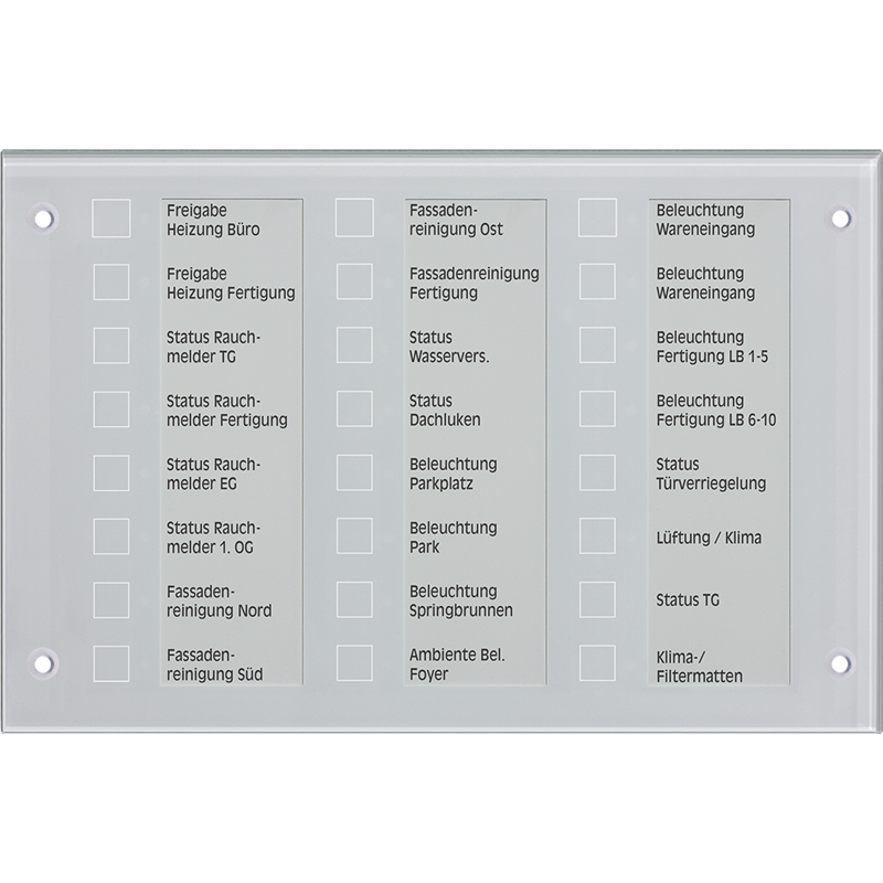 The glass panel with aluminium housing is equipped with 24 capacitive sensor buttons and 24 status LEDs.