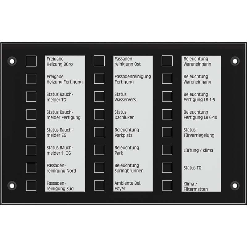 The glass panel with aluminium housing is equipped with 24 capacitive sensor buttons and 24 status LEDs.