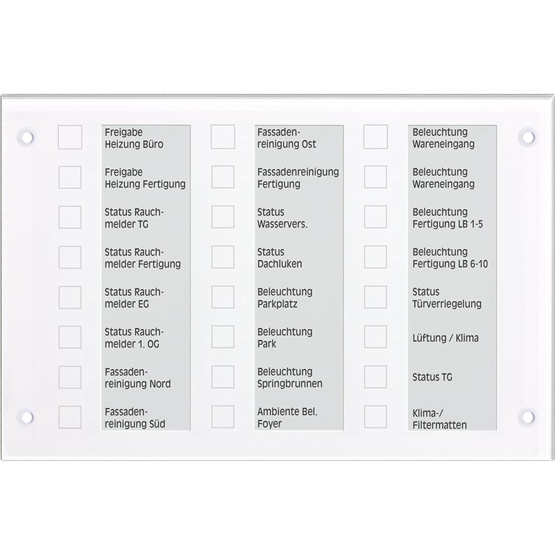 The glass panel with aluminium housing is equipped with 24 capacitive sensor buttons and 24 status LEDs.
