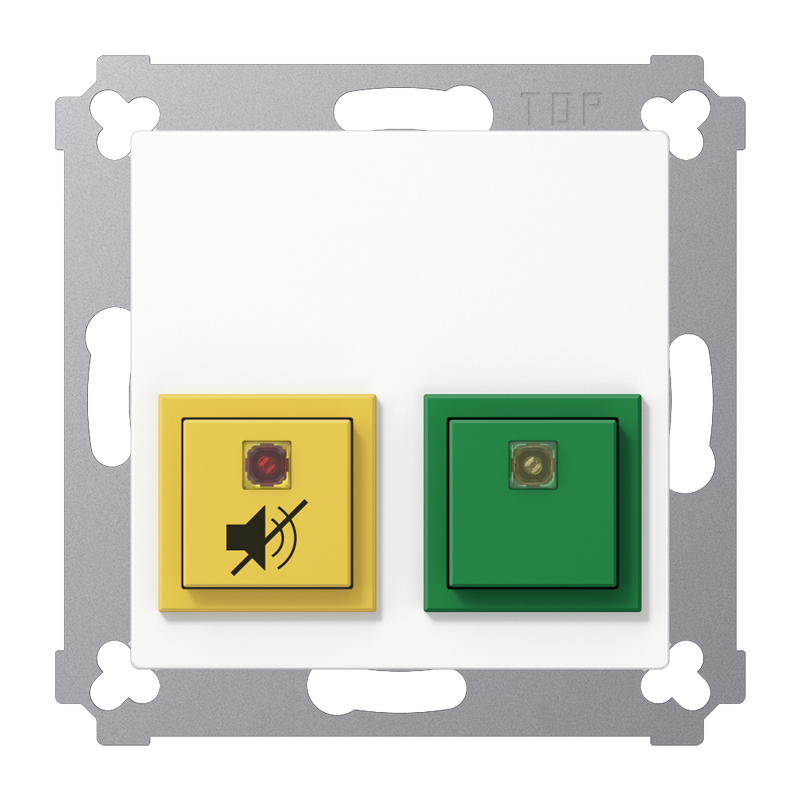 Сервисное устройство , сервисный терминал и кнопка вызова заказываются отдельно. Сервисное устройство может устанавливаться, например, в палате или приемной. Зеленая кнопка означает присутствие, нажатие желтой кнопки на 20 секунд активирует акустический сигнал сигнализатора.